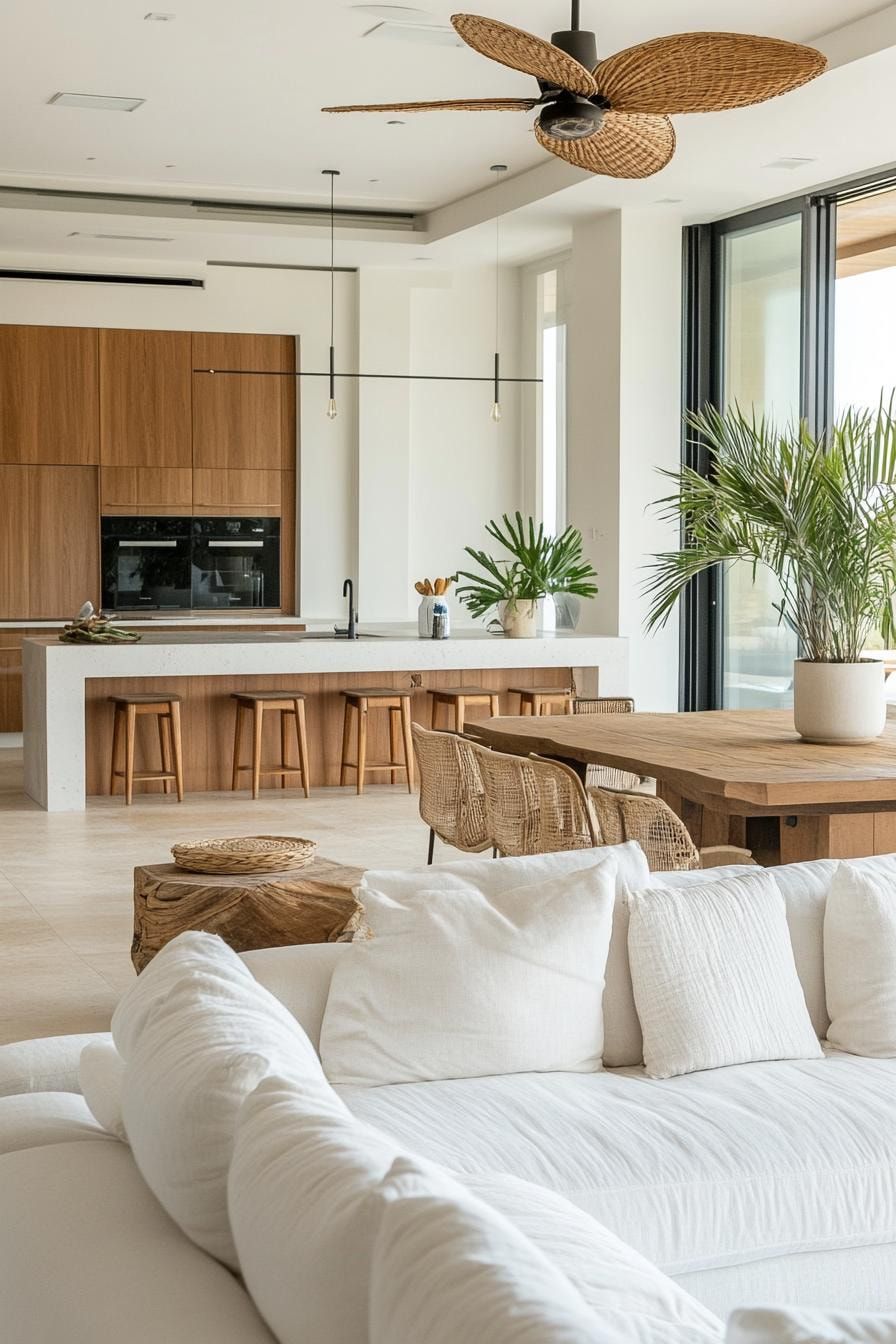 Open up living areas with stack doors or wide windows to let in natural light. Lighter wall colours, textured rugs and neutral furniture also help create a breezy summer atmosphere indoors.